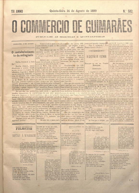Comércio de Guimarães, nº 582, de 14/08/1890