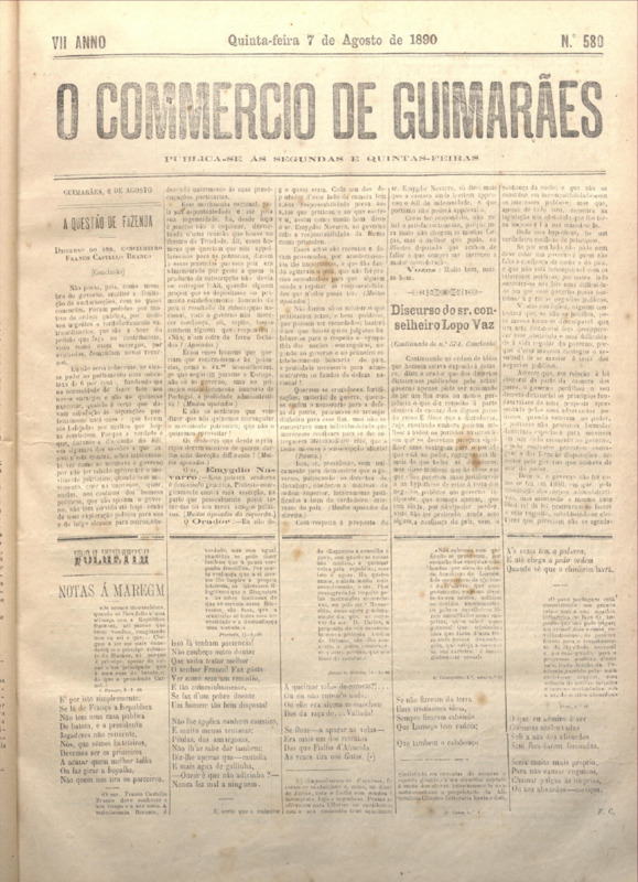 Comércio de Guimarães, nº 580, de 07/08/1890
