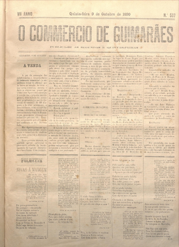 Comércio de Guimarães, nº 597, de 09/10/1890