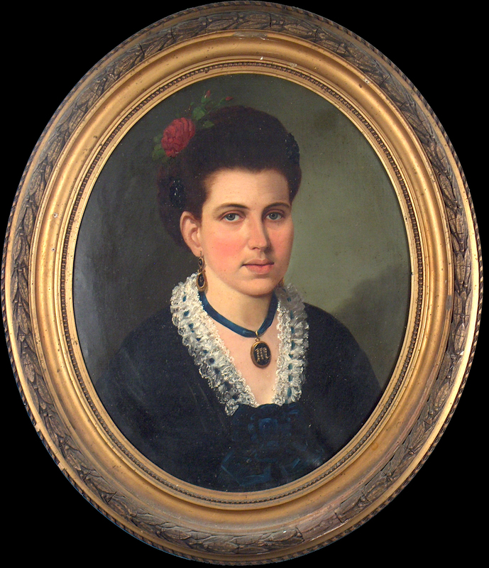 - Retrato de uma figura feminina (esposa). Moldura oval dourada.
